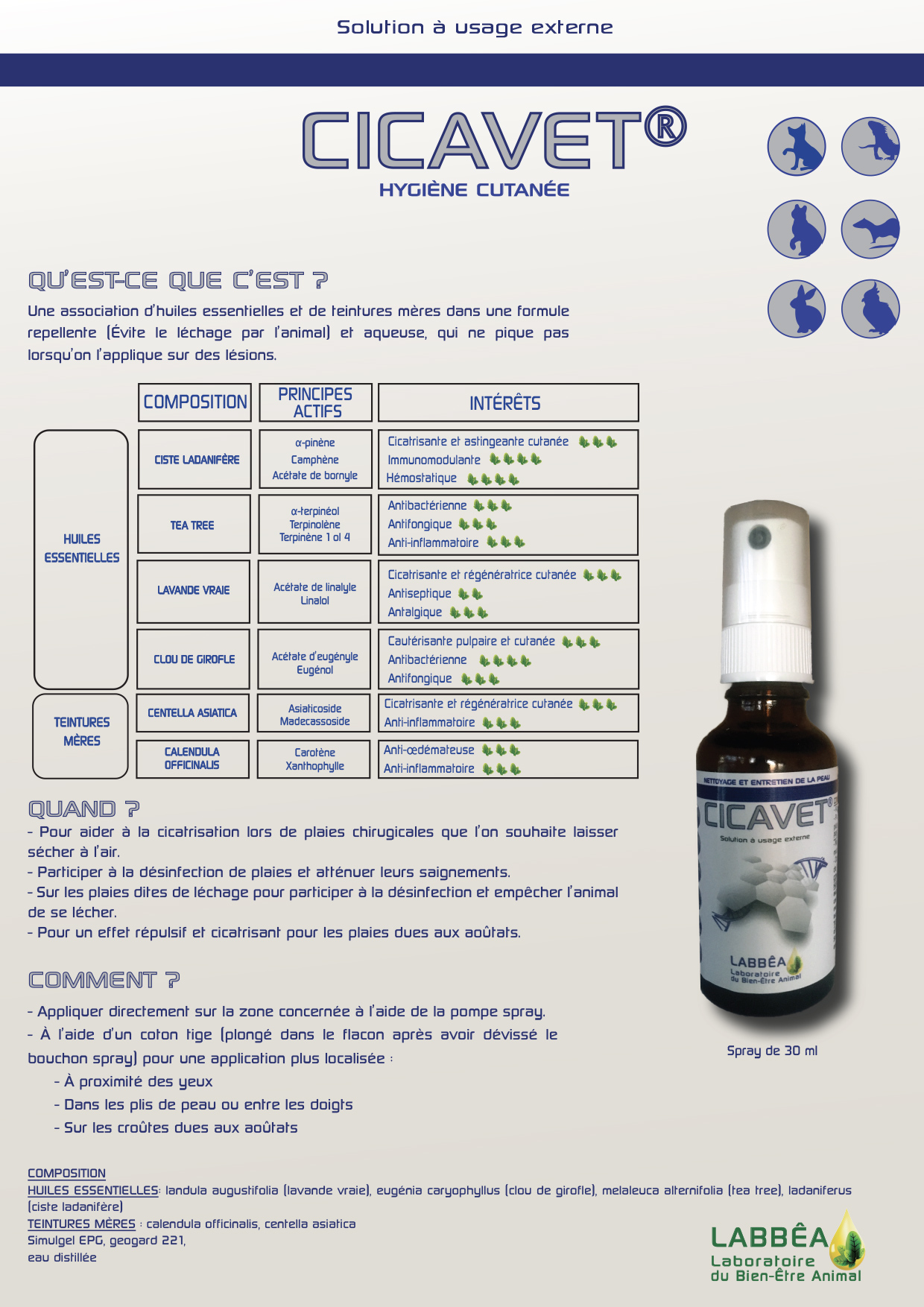 Une association d’huiles essentielles et de teintures mères dans une formule repellente (Évite le léchage par l’animal) et aqueuse, qui ne pique pas lorsqu’on l’applique sur des lésions.